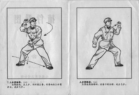 The bulk of the PLA trains four different routines called Military Boxing/Junti Quan, the first of which was published in 1976 and reprinted several times thereafter. In the 1978 version of Ti Yu Jiao Fan in our possession, the first and second Military Boxing routines are depicted as one continuous sequence. The third and fourth sequences appeared to have been created in the late 1990s and into the 2000s; we don’t have enough information at the moment to determine a more accurate creation date. All of the above routines include the traditional elements of Chinese martial arts such as kicking, punching, throwing and joint locking techniques.